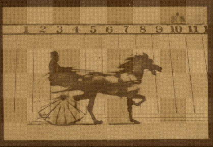 “Abe Eddington at the trot” is the first sports movie ever made. Eadweard Muybridge pioneered a method of showing images using a zoopraxiscope. This animated GIF, compiled by Jim Reardon from Library of Congress images, helps to recreate the movie.