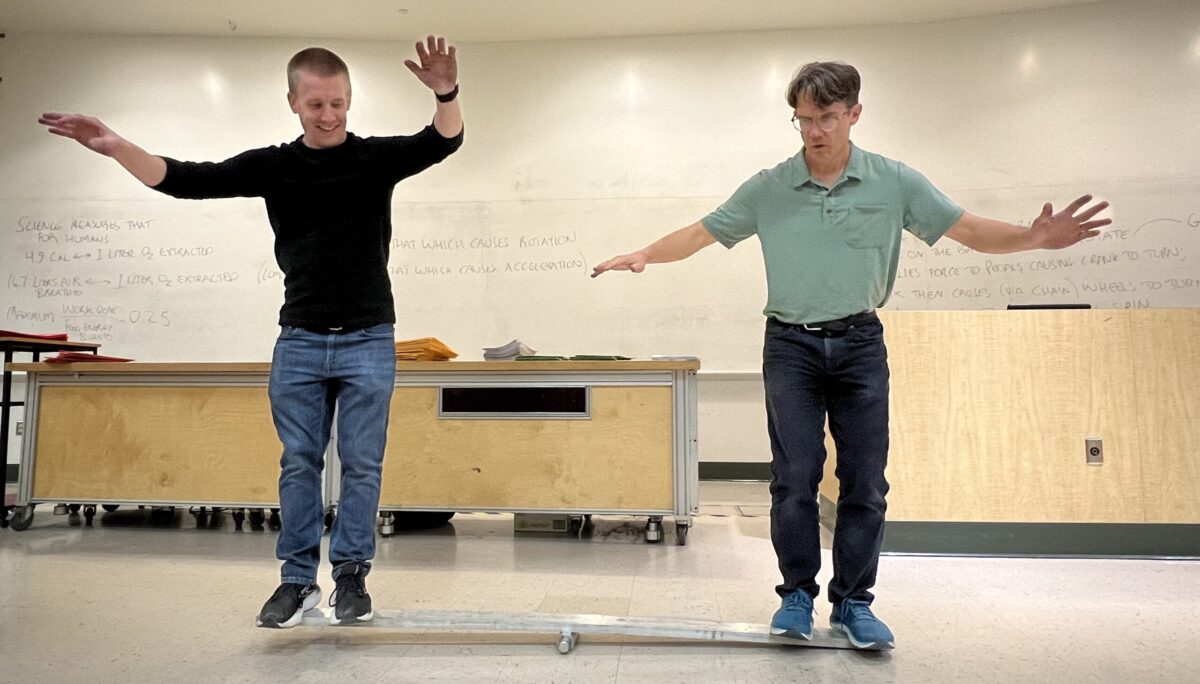 Top photo: Everyone is an expert in torque even if they don’t know it yet, says Jim Reardon. Reardon (right, with teaching specialist Mitch McNanna PhD’23), uses familiar concepts — like a seesaw that most students played on at some point in their childhood — to illustrate physics topics such as torque.