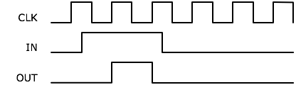 In the next example, we design a synchronous circuit which is the digital equivalent of a monostable. This circuit takes a clock and an input pulse. At the rising edge of the clock the output is brought high if and only if the input is high and the output was not previously high. Another way of looking at this is that the circuit creates output pulses synchronized with the clock which are triggered by an input pulse but are only 1 clock cycle in width, independent of the width of the input pulse. The circuit cannot trigger again until it has detected a low on the input. Here is a diagram which shows the response for an input two cycles wide: