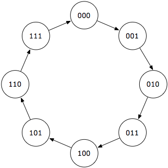 The state diagram of this FSM is shown in the figure at left. The 3 bits of the flip flops are shown inside the circles. Transitions are not labeled as there is always and only one immediate exit from each state.
