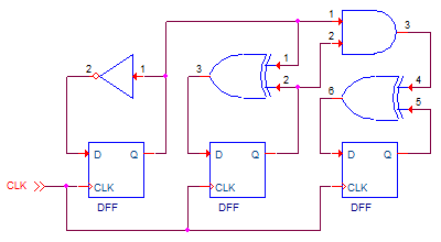 We have already discussed the limitations of the ripple counter. A better design for fast, robust counters uses an FSM and is called a synchronous counter. The goal is this: make a circuit which counts on clock edges. For clarity this example only is a 3-bit counter and doesn't include set or reset inputs that would probably be found on a real synchronous counter.