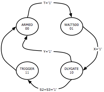 Once more we return to the muon trigger as we now have the capability to finish the design all the way through the Michel electron capture circuit. First, the states: 4 states are defined which described the operational phases of the circuit at the highest level. This is a multi-level design so, to tell you the truth, the WAIT500 and DLYGATE states actually themselves activate sub-FSMs in the design (counters). But, it helps to organize the design to separate these - a bit like subroutines in a computer program. The 4 main states are: