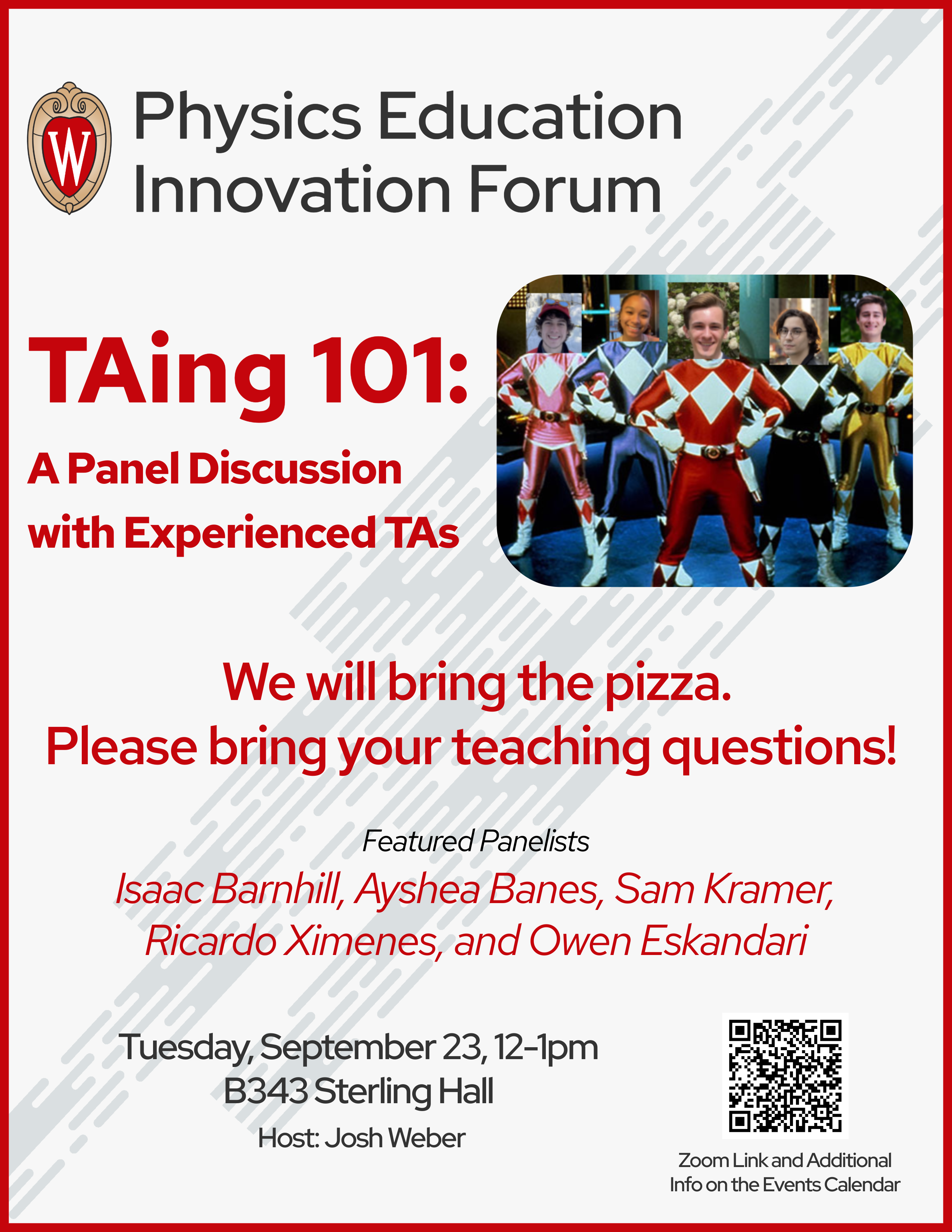 Abstract: The PEI Seminar hosts monthly presentations and discussions about new ideas in teaching physics. For the first meeting of the semester, a panel of experienced TAs will share their knowledge. We will bring the pizza. Please bring your teaching questions!