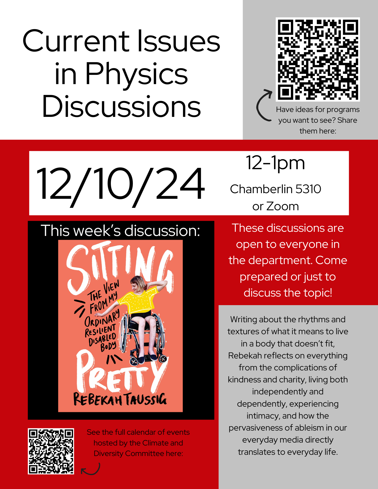 - Climate & Diversity; 12:00 pm - 1:00 pm; Chamberlin 5310 or over Zoom
