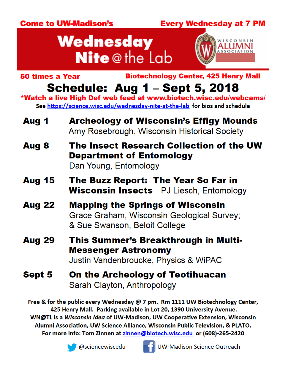 - Abstract: Professor Justin Vandenbroucke, will be giving a talk about the breakthrough in multimessenger astronomy at Wednesday Nite @ the Lab on the UW-Madison campus in the Biotech building, room 1111. This talk will be given at 7pm on August 29 and is a FREE event that's open to the public. For more information visit: