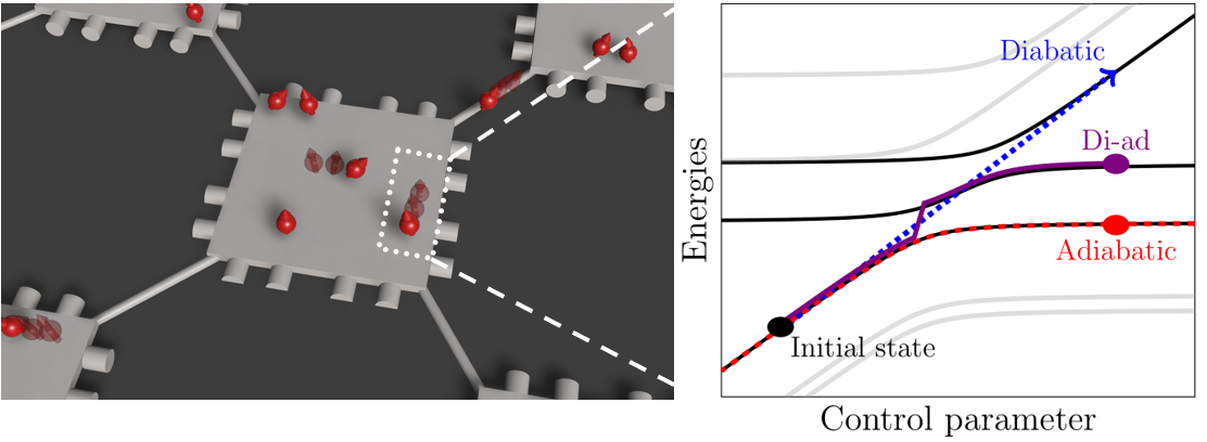 The availability of performing high-fidelity quantum operations “on the fly” during the movement instead of stopping reduces waiting times and further increases the potential for scalability. In solid-state platforms, highly coherent diabatic single-qubit operations [2] and two-qubit operations between mobile qubits were recently reported [3]. However, diabatic operations of spin qubits are even stronger limited by unwanted transitions into non-computational states such as low-lying orbital or valley states.