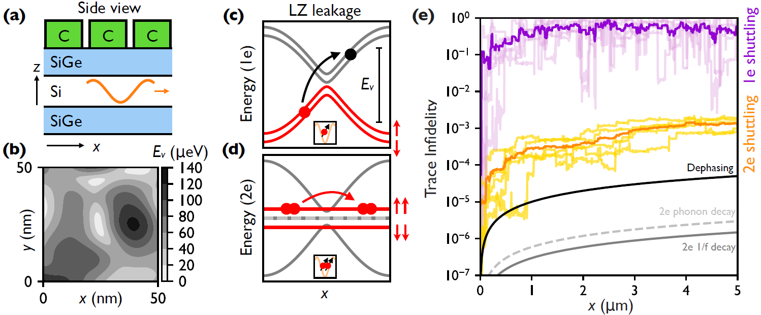 Here, we develop a multiscale simulation workflow based on the QTCAD® package to quantitatively analyze this problem. As a vehicle to this study, we consider the quantum bus (QuBus) architecture; the clavier gate voltages Vi(t) are sinusoidal with period T [Fig. (a)]. First, we obtain the time-dependent confinement potential via finite-element solutions of the Poisson equation. Second, we construct conveyor-belt atomic structures with random alloy disorder and Si/SiGe interface roughness; we relax them within the Keating model to capture strain. Third, we run position-tracked atomistic tight-binding (TB)calculations [Fig. (b)] to extract the electron’s time-dependent valley splitting [Fig. (c)] and valley phase [Fig. (d)]. Finally, these time traces parametrize a time-dependent Schrödinger equation in the valley subspace, wherein the time derivative of the valley phase drives leakage into the valley-excited state, which we solve to obtain the orbital shuttling fidelity [Fig. (e)].